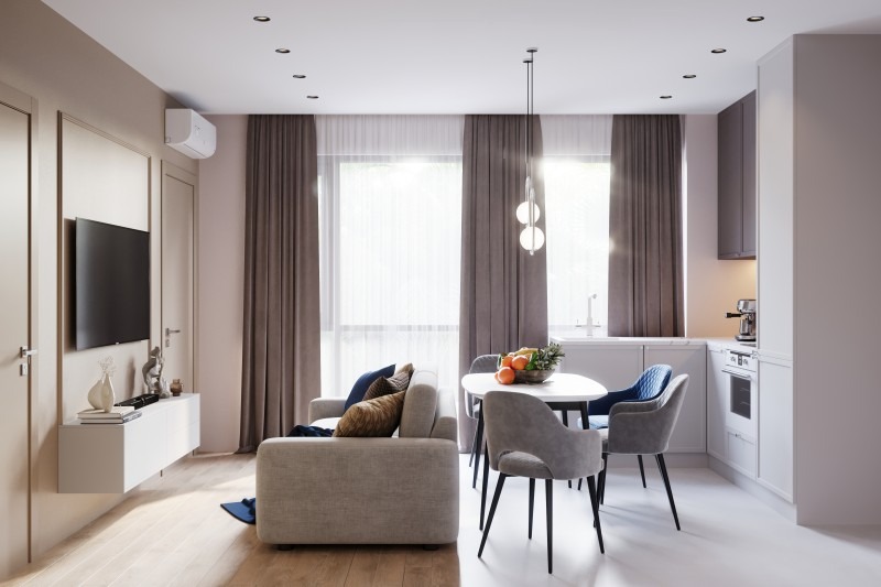 Внутри каждый юнит представляет собой образец современного подхода к дизайну помещений. Все апартаменты продаются с отделкой под ключ. Это гарантирует каждому жителю отсутствие соседей, делающих шумный продолжительный ремонт. Вы получаете пространство, полностью готовое для жизни или сдачи в аренду, где уже есть все, что нужно: от мебели до чайных ложек. Натуральные материалы — дерево и камень, сантехника и финишные покрытия стен — создадут правильное настроение у хозяев и гостей.