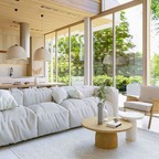 - Современная открытая кухня-гостиная, высокие потолки, панорамное остекление